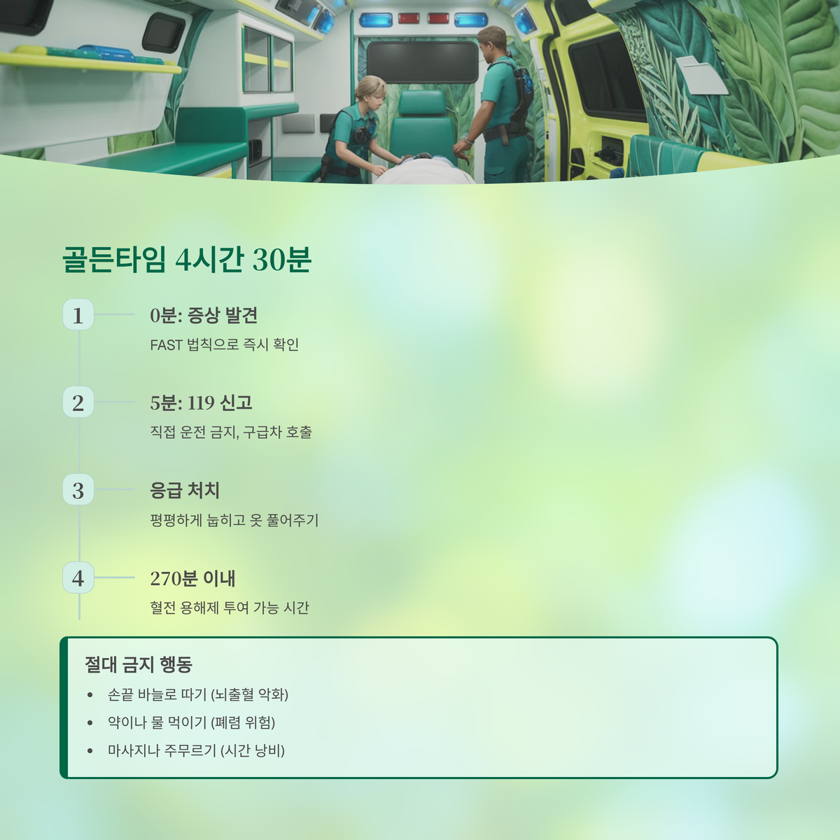 풍 치료에서 가장 중요한 것은 속도입니다. 뇌세포는 단 몇 분만 산소 공급이 끊겨도 죽기 시작하며, 한 번 죽은 뇌세포는 재생되지 않습니다. 4시간 30분은 혈전 용해제를 투여하여 막힌 혈관을 뚫을 수 있는 마지노선입니다.