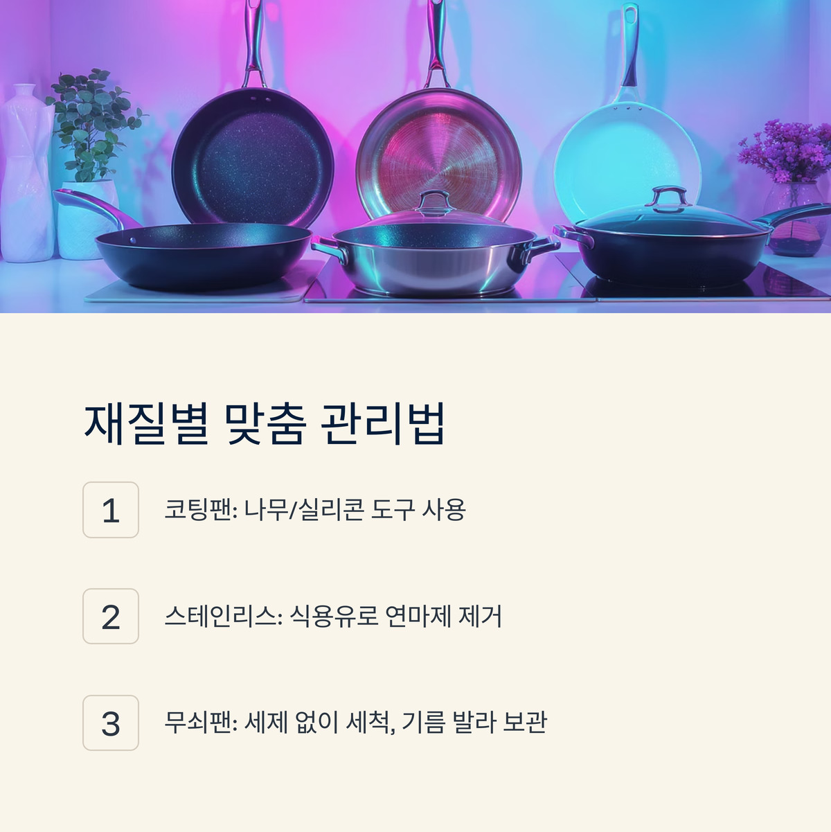 조리 도구는 나무나 실리콘으로 바꾸고, 팬을 쌓아 보관할 땐 사이에 천이나 키친타월을 끼워 긁힘을 방지하세요. 이런 작은 습관이 프라이팬의 수명을 몇 년이나 늘려줄 수 있어요!