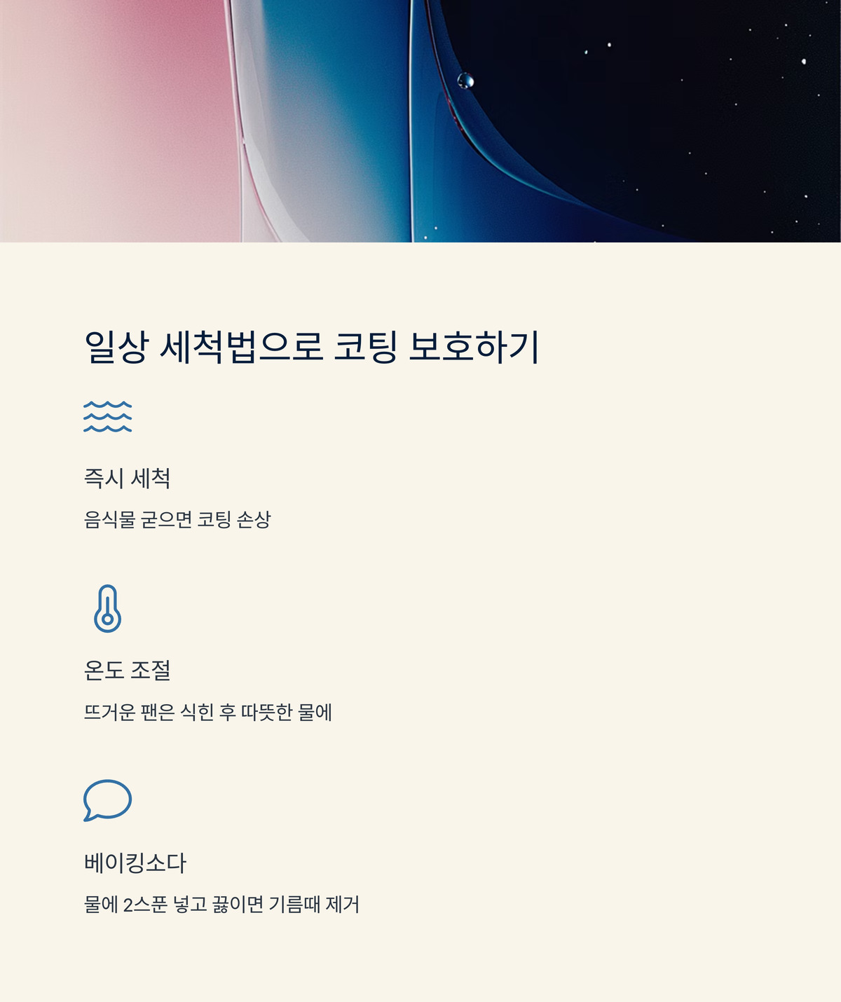 베이킹소다는 알칼리성이라 기름때를 녹이는 데 최고예요. 게다가 코팅을 손상시키지 않아 안전하죠. 단, 주방세제를 너무 많이 쓰면 코팅이 약해질 수 있으니 적당히 사용하는 게 좋아요.