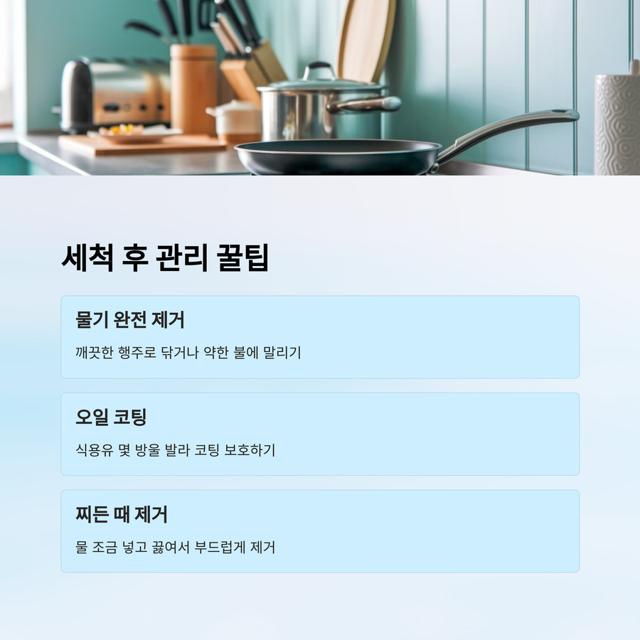 2024년 주방용품 가이드에서 물기 제거가 팬 수명 늘리는 데 효과적이라고 했어요. 이런 습관 들이면 오래 쓸 수 있어요.