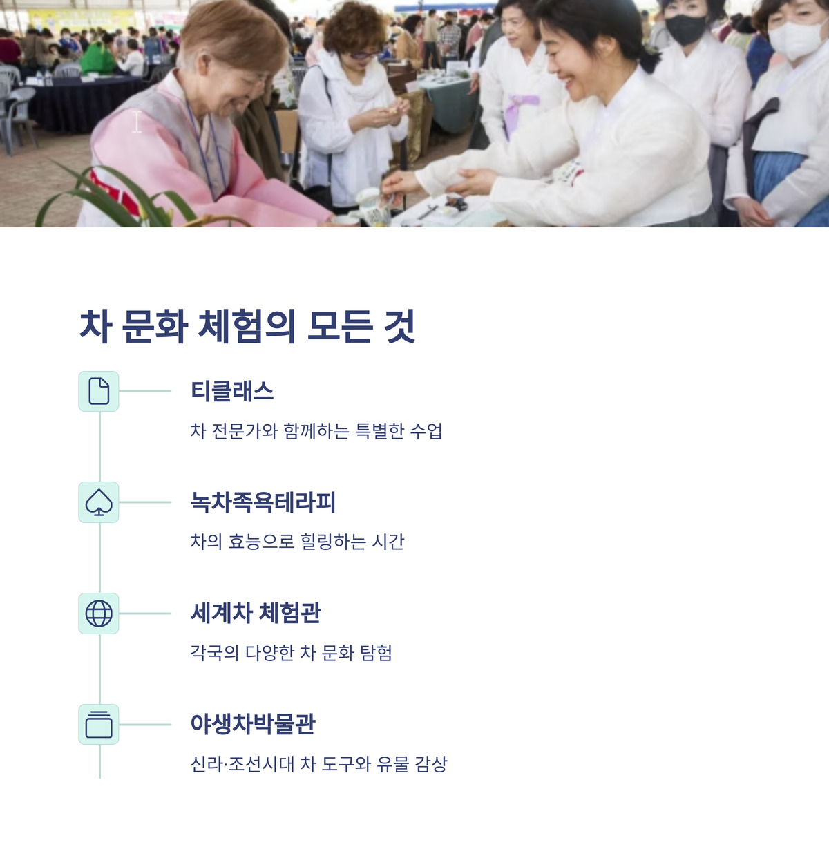 하동야생차문화축제는 차 문화를 깊이 느낄 수 있는 체험의 장이에요. 티클래스와 녹차족욕테라피로 힐링을, 제다체험과 다례체험으로 전통을 배워보세요.