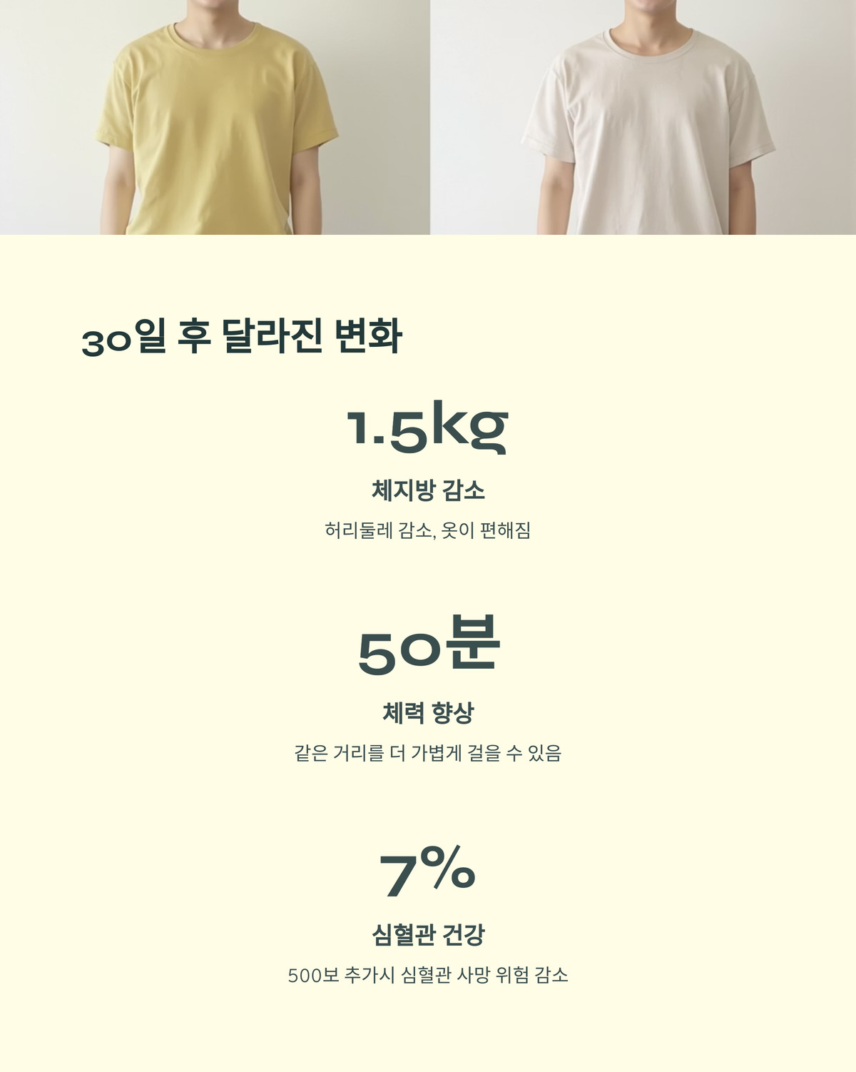 만보 걷기는 심혈관 질환 위험을 줄이는 데 효과적이에요. 하루 500보 추가할 때마다 심혈관 사망 위험이 7% 감소한다는 연구 결과도 있죠. 30일 동안 꾸준히 걸으며 심박수가 안정되고, 혈액순환이 좋아진 느낌을 받았어요.