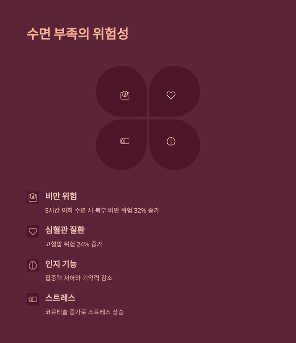 수면 시간이 부족하면 건강에 빨간불이 켜져요. 예를 들어, 수면이 5시간 이하인 사람은 고혈압 위험이 24% 높아진다는 연구가 있어요(고대안산병원). 또, 식욕을 억제하는 렙틴 호르몬이 줄어들어서 야식을 찾게 될 수도 있죠. 건강한 잠이 얼마나 소중한지 새삼 느껴지네요.