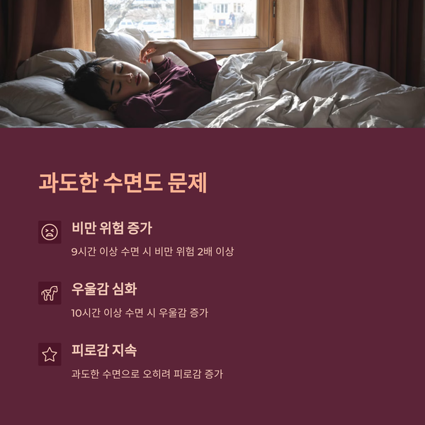 그렇다고 하루 수면 시간이 9시간을 넘으면 무조건 좋은 것도 아니에요. 한국식품커뮤니케이션포럼 자료를 보면, 9시간 이상 자는 사람은 비만 위험이 2배 이상 높아진다고 해요. 또, 10시간 넘게 자는 경우 우울감이나 피로감이 더 심해질 수 있다는 연구도 있죠. 적당한 게 최고라는 거예요!