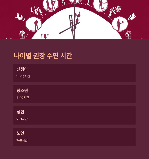 나이에 따라 적정 수면 시간이 달라진다는 사실, 알고 계셨나요? 예를 들어, 신생아는 하루 14~17시간을 자야 하고, 청소년은 8~10시간이 필요해요. 성인은 7~8시간이면 충분하지만, 65세 이상 어르신들은 7~8시간 정도로 약간 줄어든다고 해요. 2025년 연구에서도 나이에 맞춘 수면 패턴이 건강에 중요한 영향을 미친다고 강조하고 있죠.