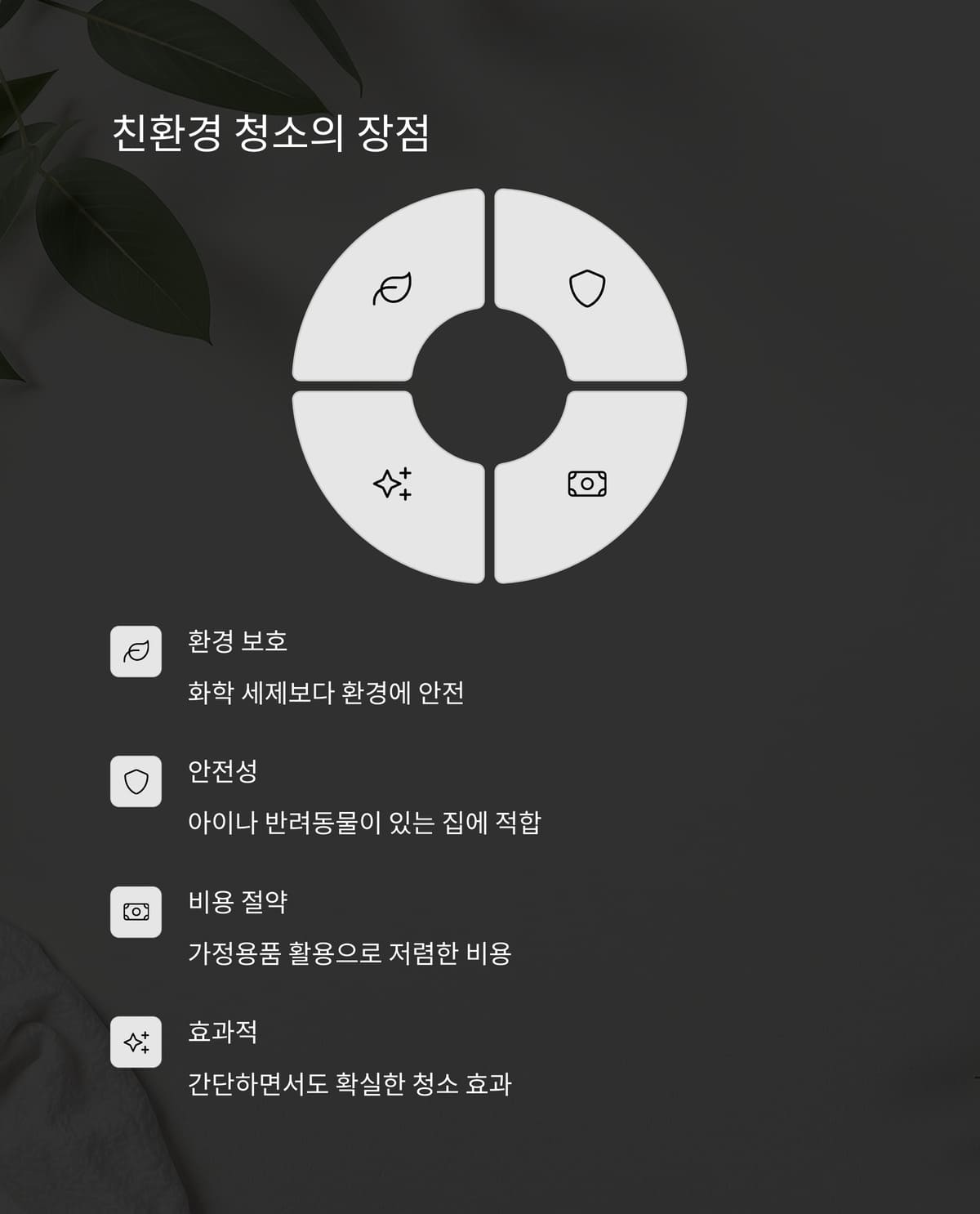 식초, 베이킹소다, 콜라 같은 가정용품은 화학 세제보다 안전하고 환경에도 좋아요. 아이나 반려동물이 있는 집에서도 안심하고 사용할 수 있죠. 게다가 비용도 저렴해서 일석이조예요!