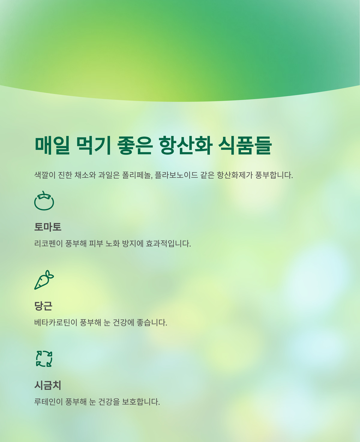 항산화 식품은 신선한 상태로 먹는 게 가장 좋아요. 색깔이 진한 채소와 과일은 폴리페놀, 플라보노이드 같은 항산화제가 풍부하죠. 토마토, 당근, 시금치, 석류도 노화 방지에 탁월해요.