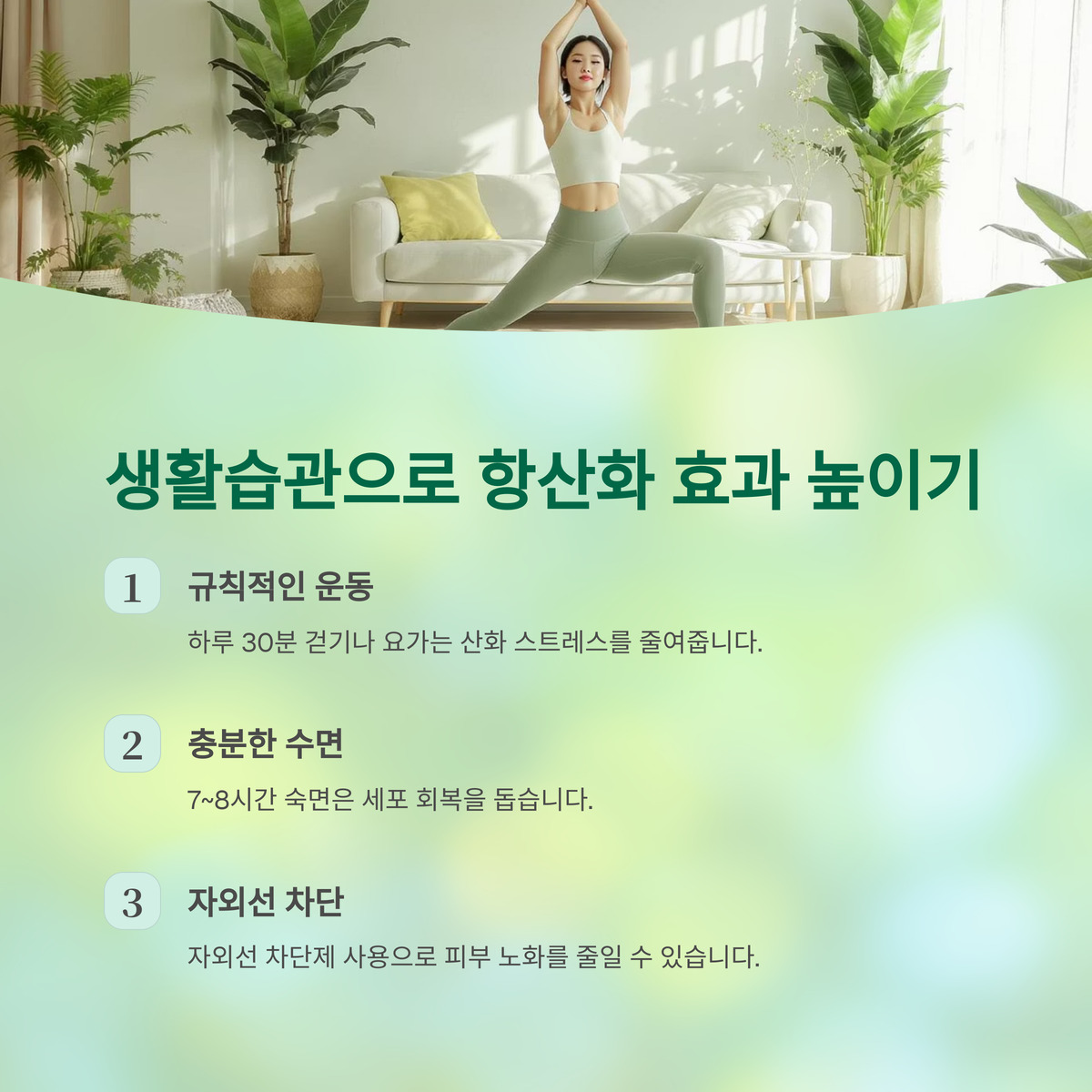 하루 30분 걷기나 요가는 산화 스트레스를 줄여줘요. 7~8시간 숙면도 세포 회복을 돕고, 자외선 차단제를 사용하면 피부 노화를 줄일 수 있어요.