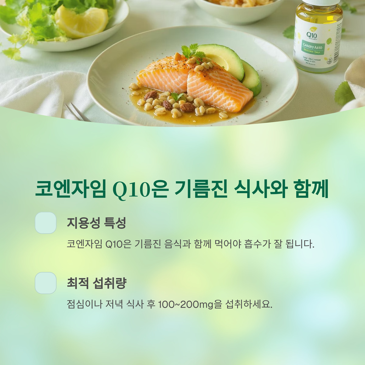 코엔자임 Q10은 지용성이어서 기름진 음식과 함께 먹어야 흡수가 잘돼요. 점심이나 저녁 식사 후 100~200mg을 섭취하면 좋아요. 연어, 견과류 같은 음식과 조합하면 항산화 효과가 더 강력해져요.