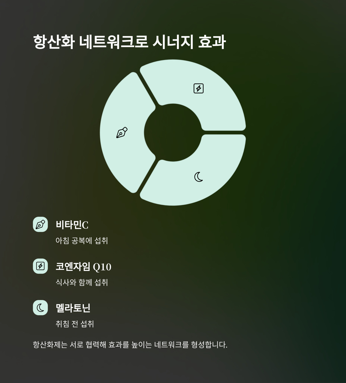 항산화제는 서로 협력해 효과를 높이는 네트워크를 형성해요. 비타민C는 코엔자임 Q10을 재활용하고, 멜라토닌은 비타민C의 항산화력을 강화해요. 이 시너지가 세포 보호를 극대화하죠.