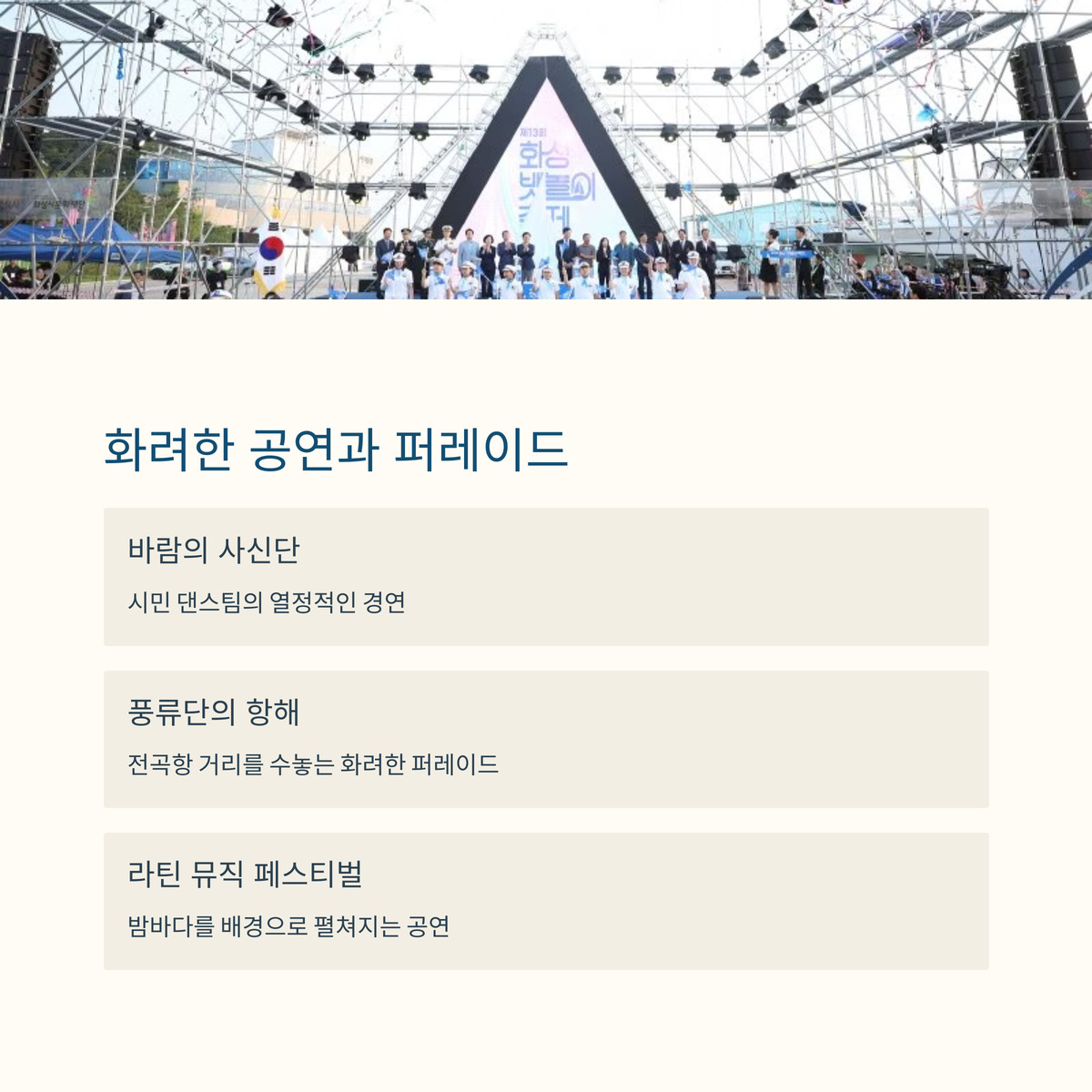 2025년 제15회 축제는 ‘문화를 담은 바닷길, 섬을 여는 하늘길’ 슬로건 아래 더욱 풍성한 프로그램으로 돌아왔어요. 화성의 바다에서 특별한 여름을 시작하고 싶다면 이곳으로 오세요!