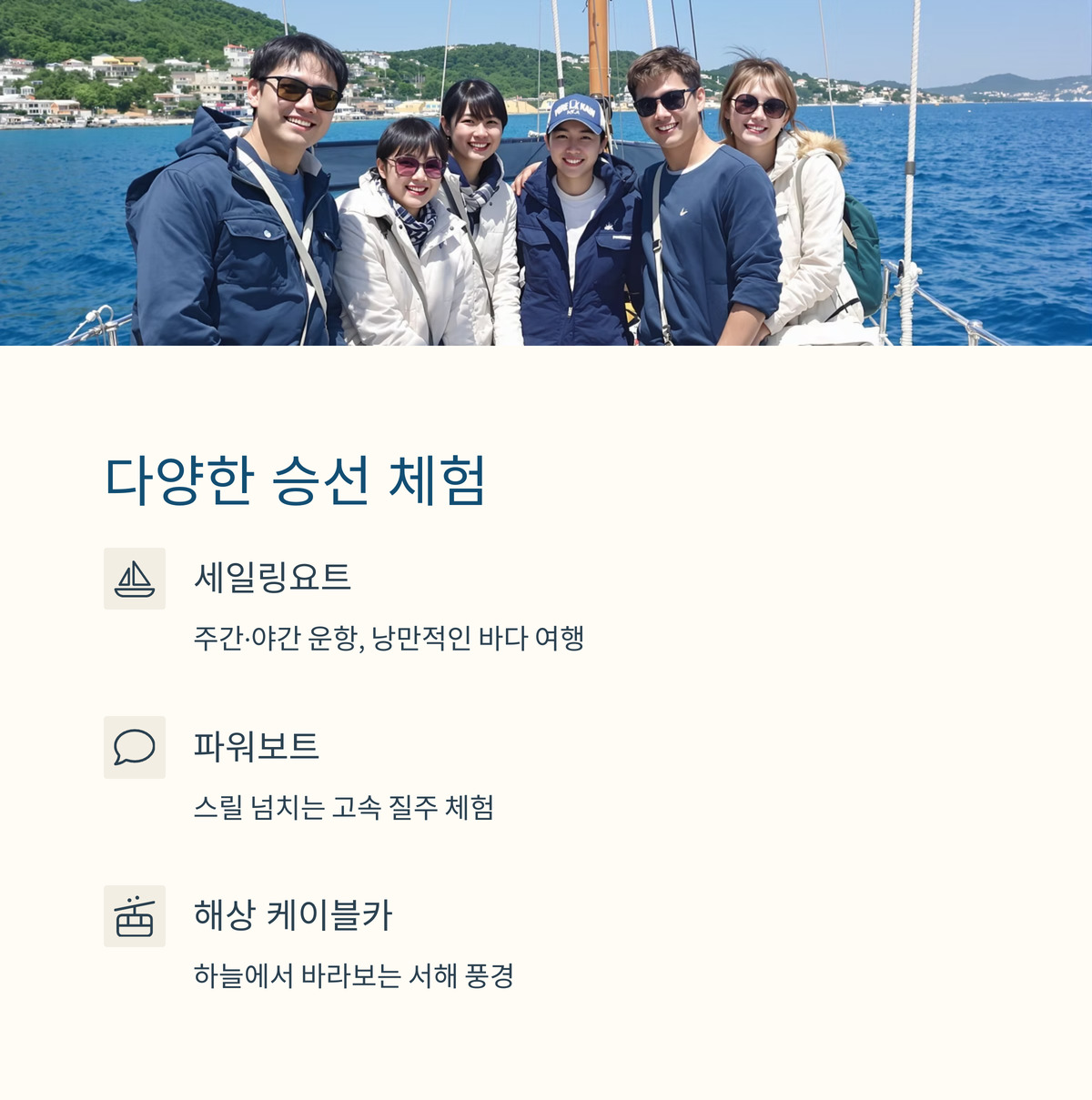 - 세일링요트: 주간·야간 운항, 낭만 가득한 바다 여행.