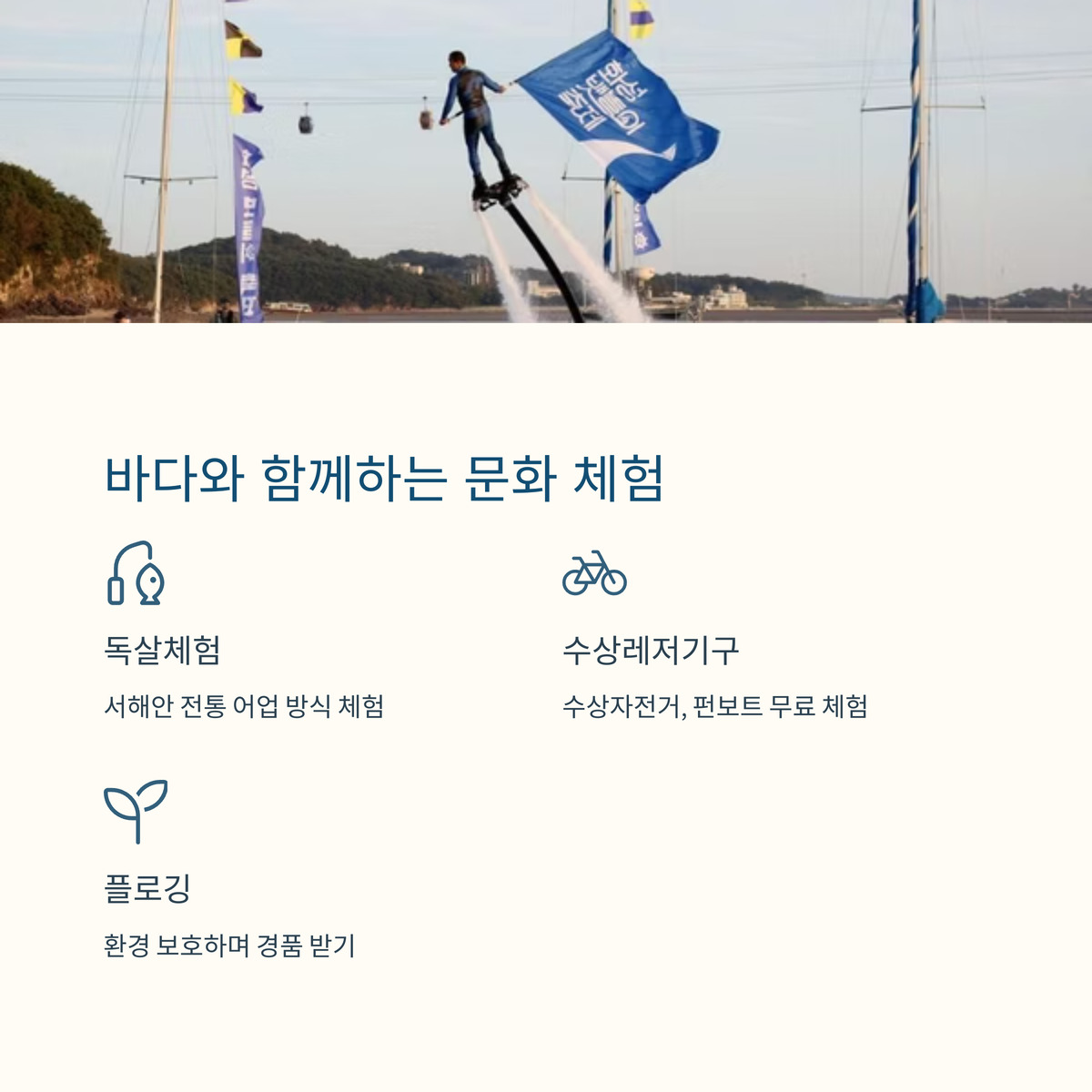 - 독살체험: 서해안 전통 어업 방식 체험.