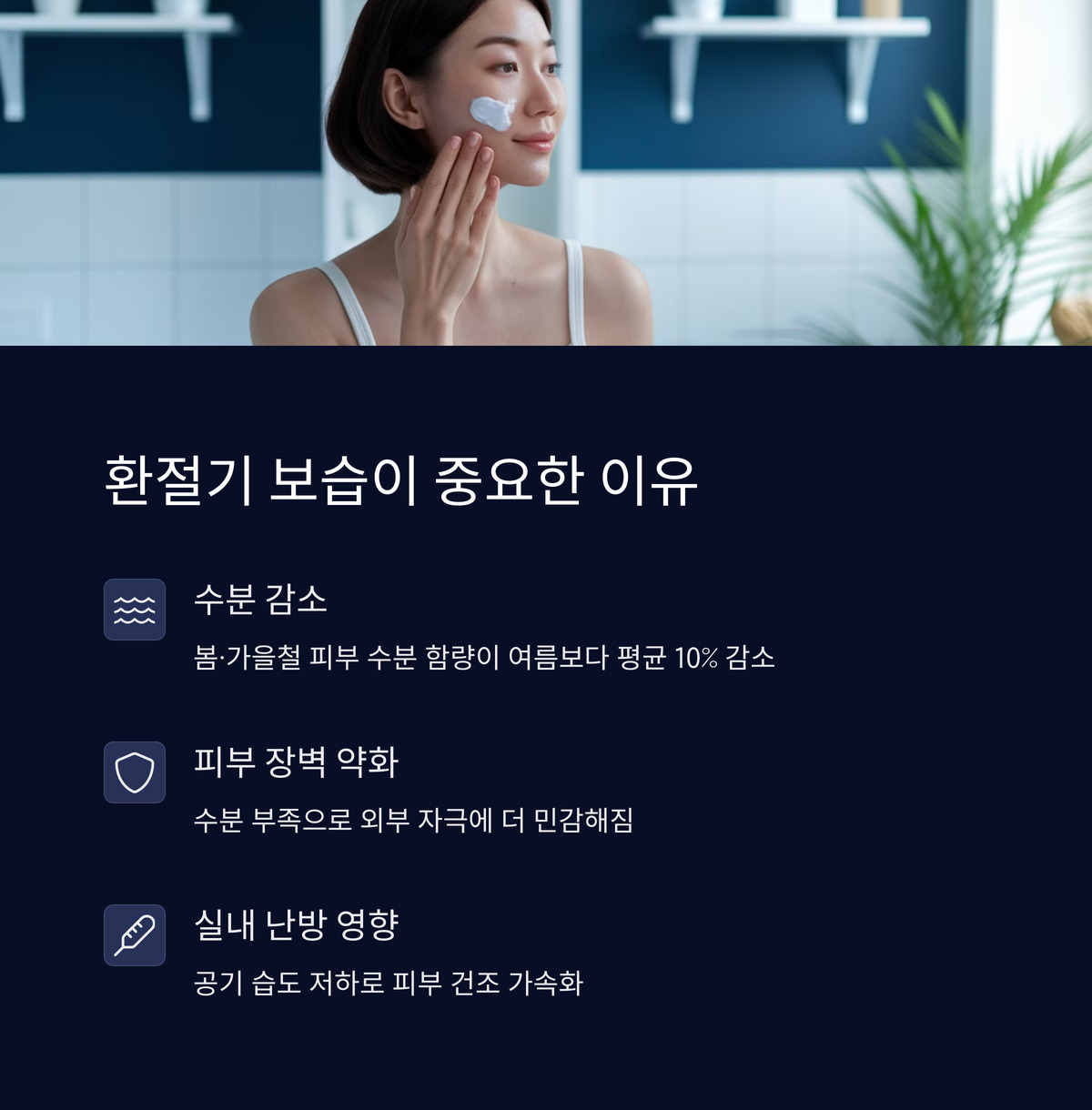 보습 안 하면 피부가 거칠어지고 트러블까지 생길 수 있어요. 그러니까 환절기 피부관리 할 때 수분을 채우고 그걸 잘 지켜주는 게 핵심이에요. 촉촉한 피부가 있어야 외부 자극에도 덜 민감해지니까요.