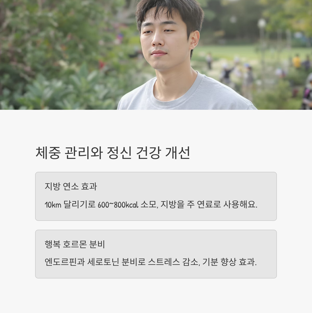 연구에 따르면, 꾸준한 유산소 운동은 불안과 우울 증상을 줄이는 데 효과적이에요. 10km LSD 러닝은 격렬한 운동처럼 몸을 혹사시키지 않으면서도 이런 정신적 이점을 충분히 누릴 수 있어요. 달리면서 좋아하는 음악을 듣거나, 자연 속에서 바람을 느끼면 일상의 걱정이 한결 가벼워질 거예요. 바쁜 하루 끝에 10km를 달리고 나면, 마치 리셋 버튼을 누른 듯 상쾌한 기분이 든답니다.