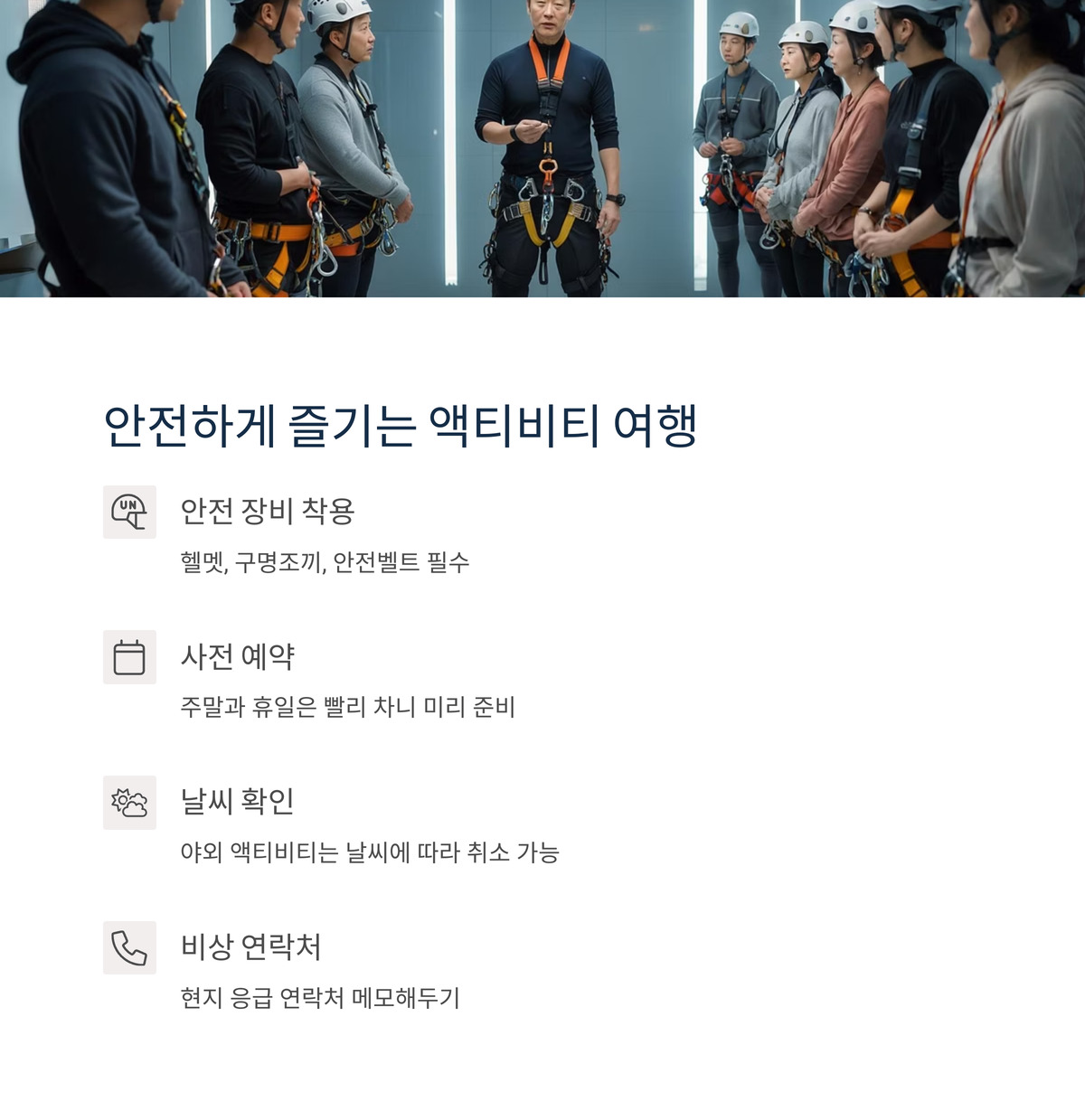 - 날씨 확인: 야외 액티비티는 날씨에 따라 취소될 수 있음