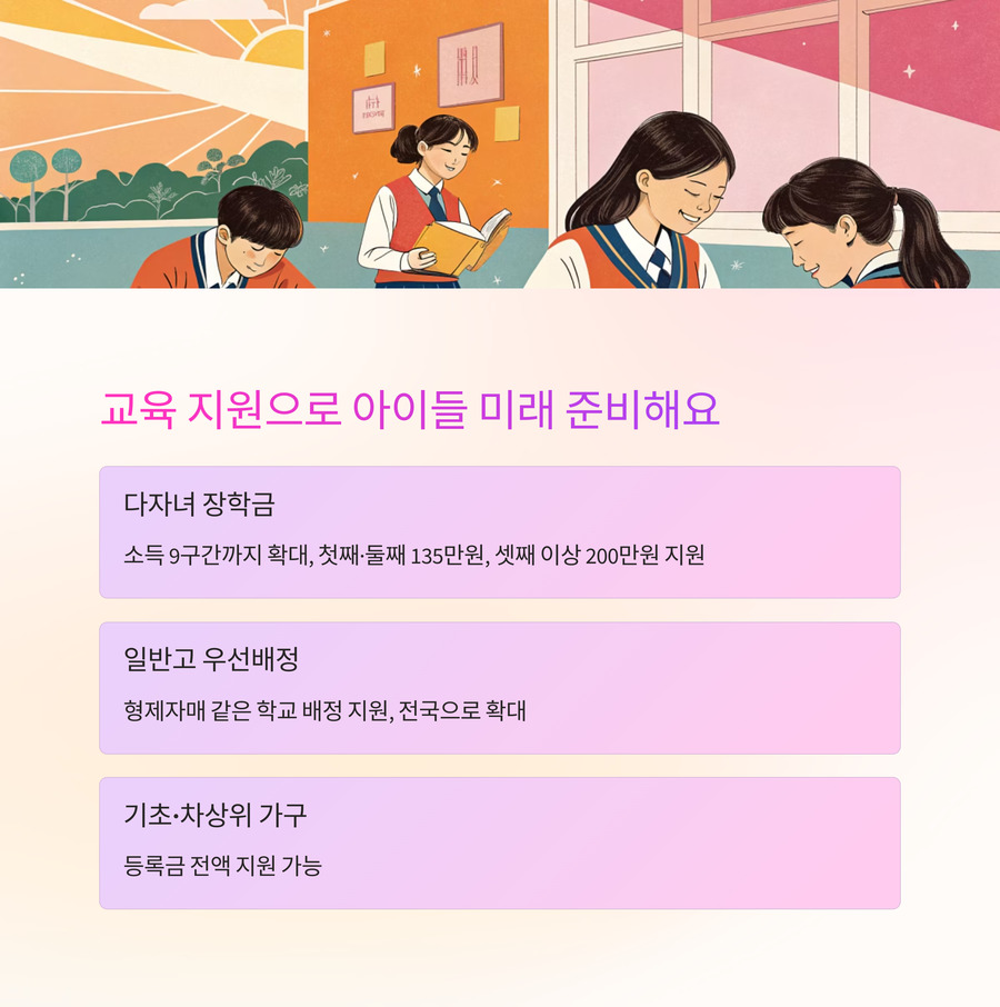 교육비 걱정 많은 다자녀 가정에겐 장학금 소식도 반갑죠. 2025년부터 다자녀 장학금 소득 요건이 8구간에서 9구간으로 완화됐어요. 첫째랑 둘째는 135만 원, 셋째 이상은 200만 원 지원받을 수 있대요. 기초·차상위 가구는 등록금 전액 지원도 가능하다고 하네요.