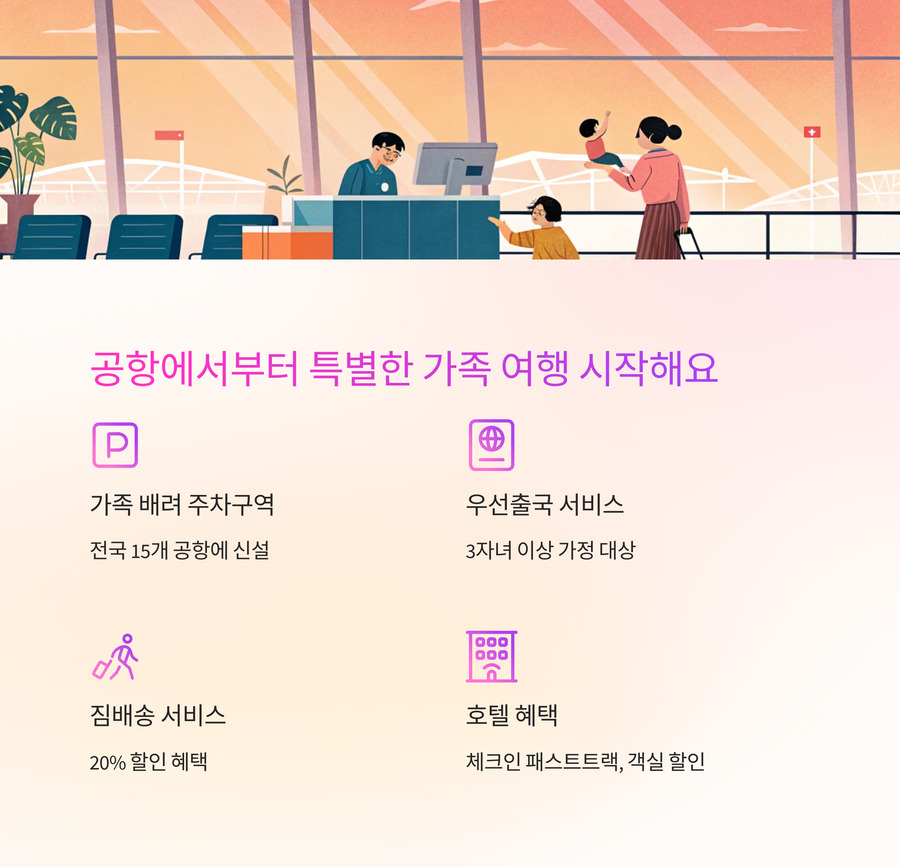 이제 다자녀 양육가정은 공항에서도 특별 대우 받아요! 전국 15개 공항에 가족 배려 주차구역이 새로 생겼고, 인천공항에선 다자녀 가정(3자녀 이상, 19세 미만) 대상으로 우선출국 서비스도 시작됐어요. 짐배송 서비스도 20% 할인된다고 하네요.