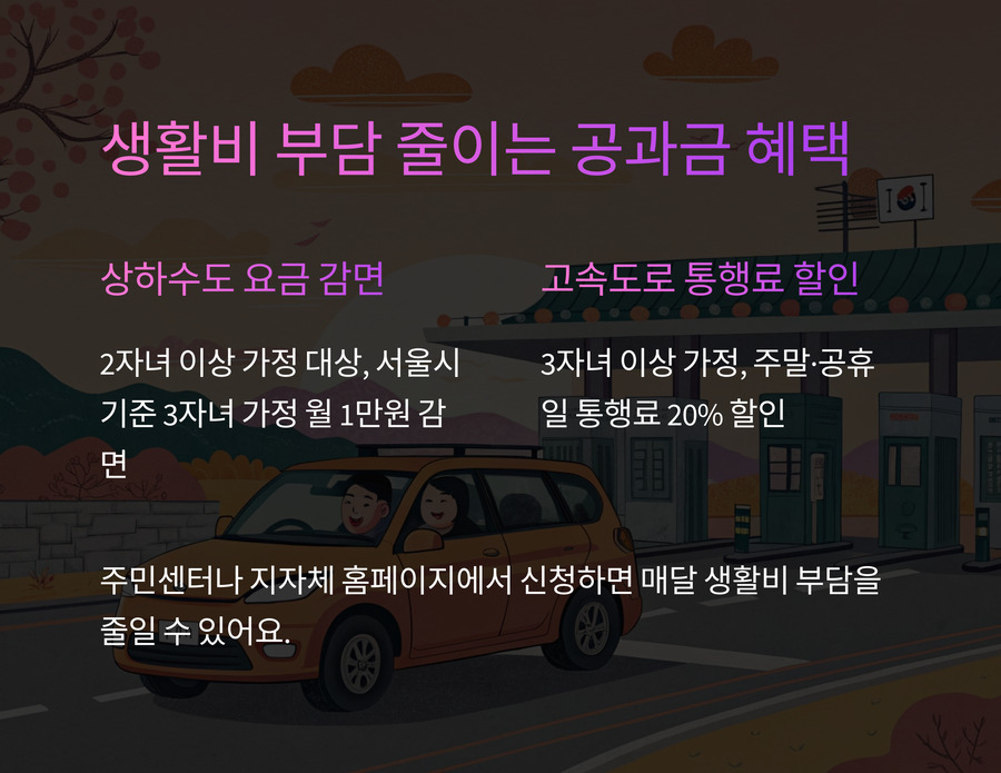 다자녀 양육가정이 주말 나들이 갈 때도 혜택이 있어요. 3자녀 이상 가정은 주말이랑 공휴일에 고속도로 통행료 20% 할인받을 수 있대요. 19세 미만 자녀가 3명 이상인 가정이 대상인데, 가족 차 타고 여행 갈 때 부담 덜 되겠죠?
