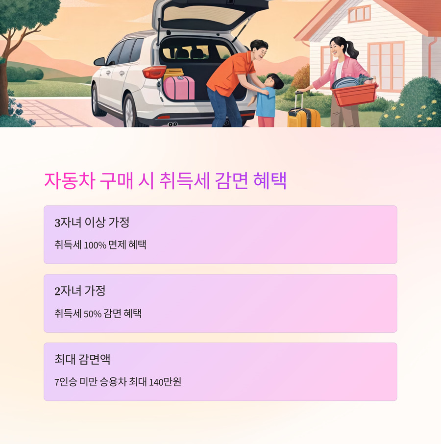 다자녀 양육가정이라면 자동차 하나 장만할 때도 혜택이 있어요. 자동차 취득세 감면이 3자녀 이상 가정은 100% 면제, 2자녀 가정은 50% 감면으로 확대됐어요. 예를 들어, 7인승 미만 승용차라면 최대 140만 원까지 감면 가능하다고 하네요. 이건 2024년 12월 31일까지 등록한 차량에 적용되니까 서두르셔야 할 거예요.
