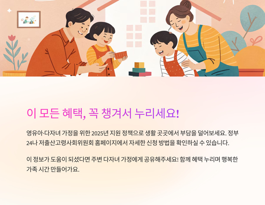 아이들 웃는 얼굴 보면서 부모 마음도 편해지는 기분, 진짜 소중하죠. 다자녀 가정도 이런 지원 덕에 육아 부담이 확 줄어들 거예요.