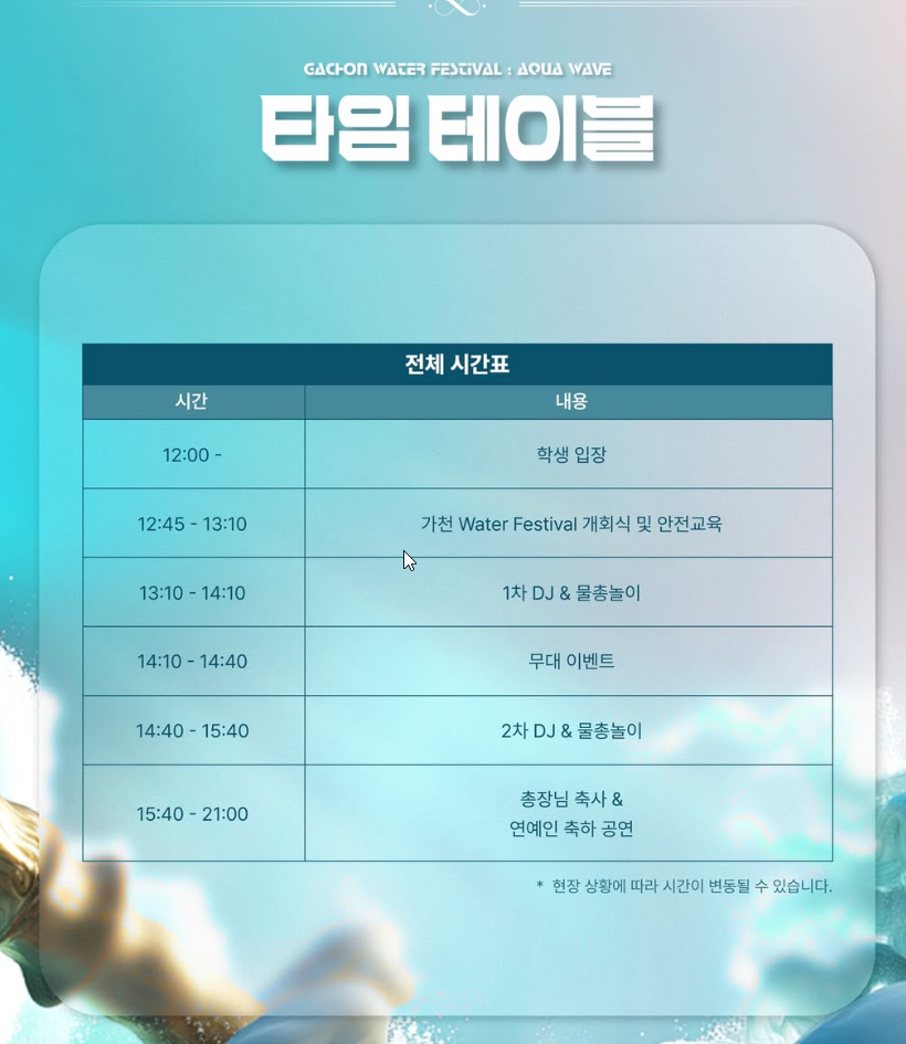 하루 동안 펼쳐지는 강렬한 축제예요! 세부 일정은 가천대 공식 인스타그램에서 확인하면 더 편리해요!