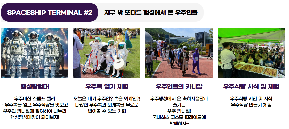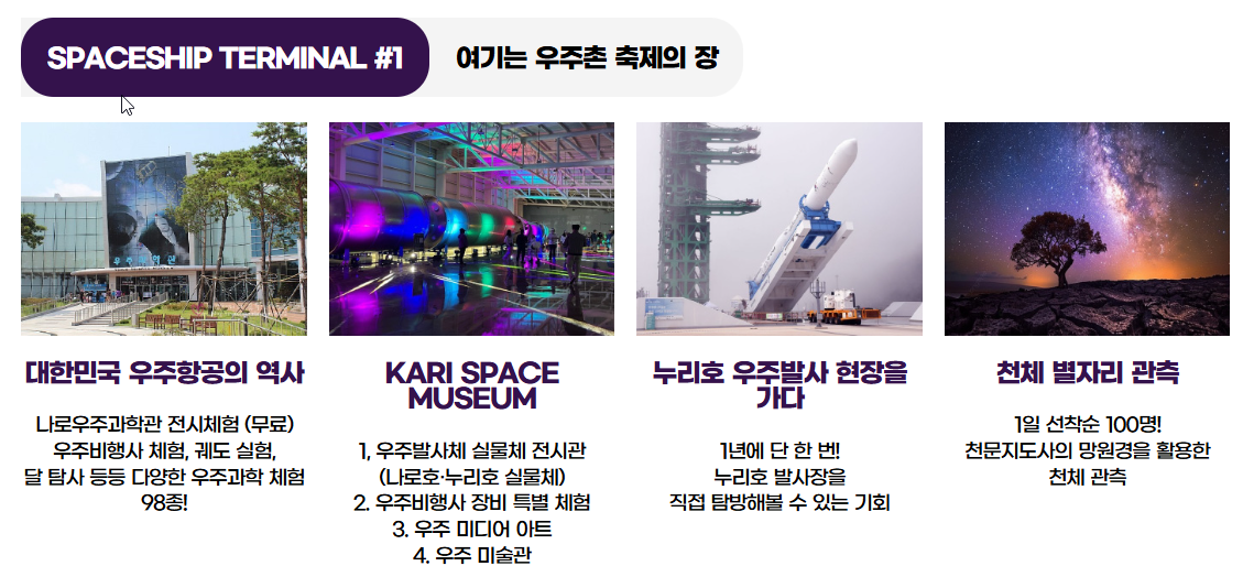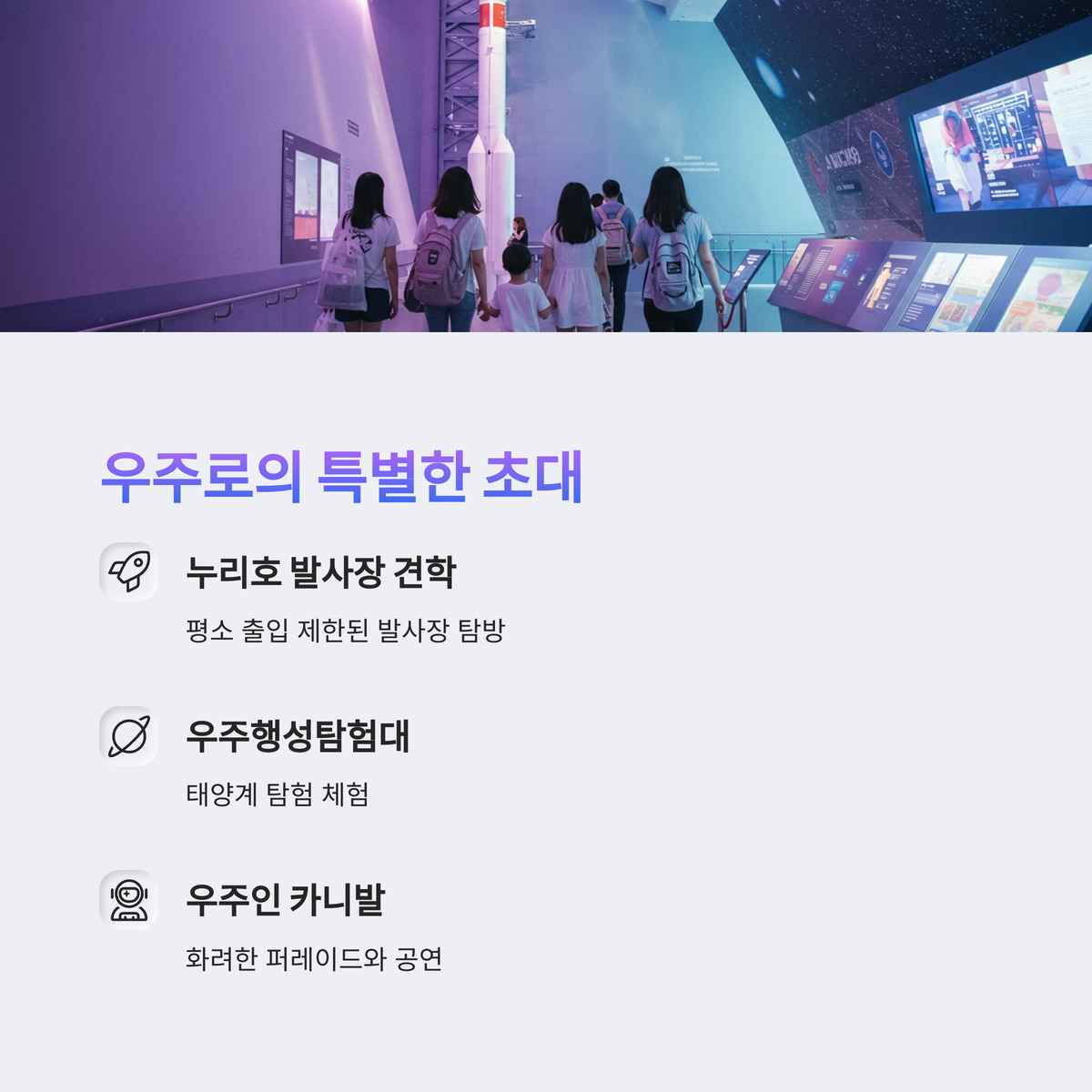 누리호 발사장 견학, 우주과학 체험, 우주인 카니발 등으로 아이부터 어른까지 우주의 매력을 만끽할 수 있어요!