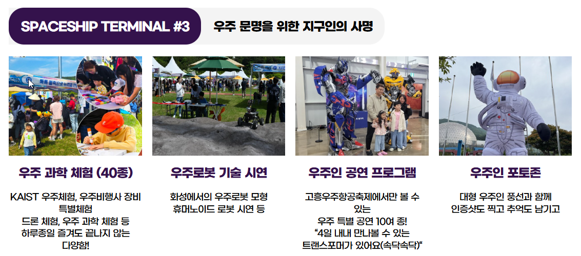 우주인 카니발은 트랜스포머 로봇 공연, 우주 댄스, 마술쇼로 분위기를 띄워요. 우주로봇 기술 시연은 KAIST가 선보이는 첨단 과학 쇼죠.