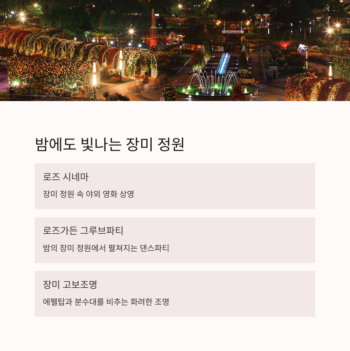 - 야간 방문: 밤 10시까지 운영되니 조명 아래 장미를 즐겨보세요.