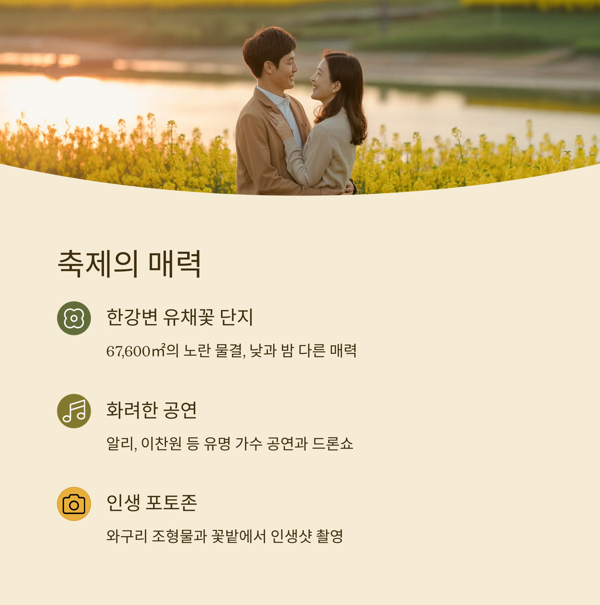 구리 유채꽃 축제는 한강변의 유채꽃 꽃단지와 감성적인 야경, 다채로운 공연과 체험으로 봄의 낭만을 선사해요. 가족, 연인과 함께 잊지 못할 추억을 만들어보세요.