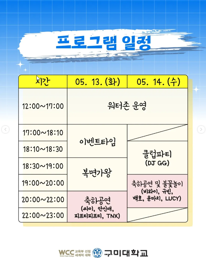 구미대학교 축제의 핵심은 뭐니 뭐니 해도 초청 가수들의 무대! 5월 13일과 14일, 이틀간 펼쳐지는 공연은 K-POP, 힙합, 밴드까지 다양한 장르로 가득해요. 어떤 아티스트들이 오는지, 짤막한 소개와 함께 확인해 보세요!