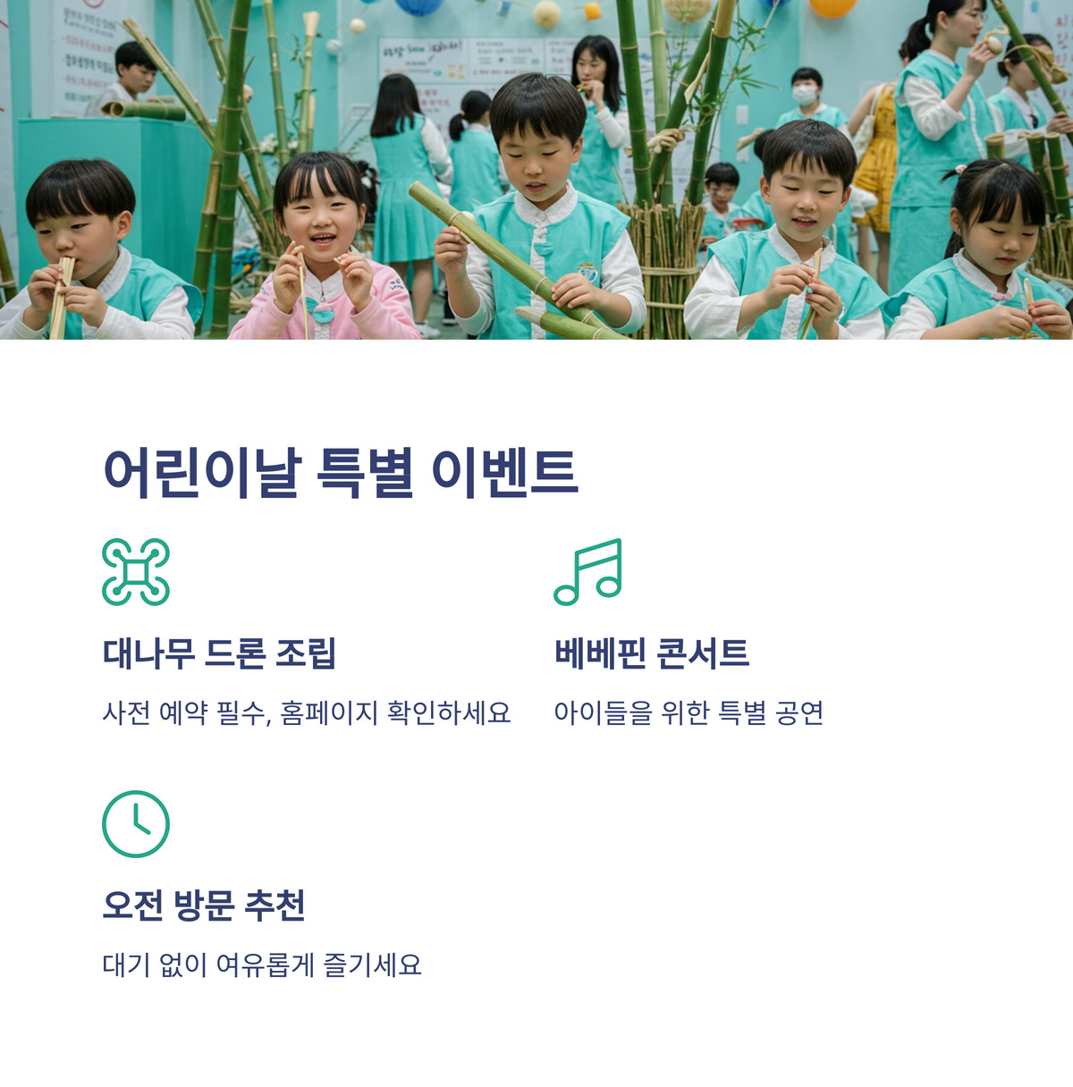 5월 5일 어린이날에는 대나무 드론 조립 체험과 베베핀 콘서트가 아이들을 기다려요. 드론 체험은 사전 예약이 필수니 홈페이지를 확인하세요!