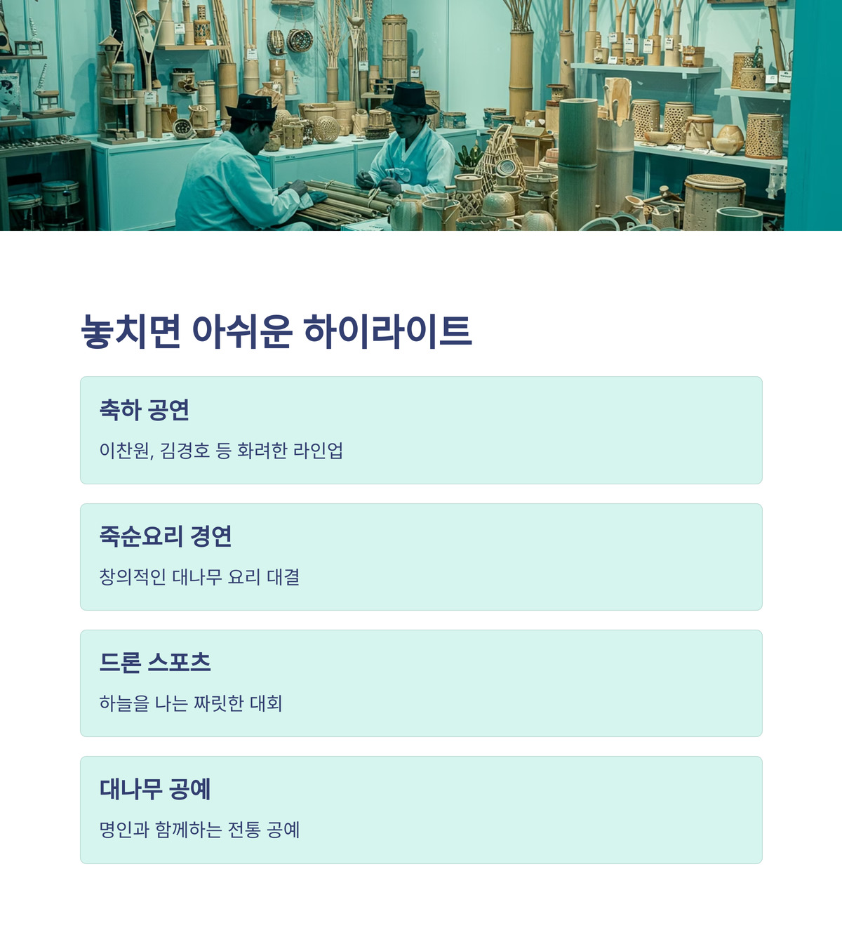 담양 대나무축제는 공연, 체험, 경연 등 다채로운 프로그램으로 가득해요. 놓치면 아쉬운 하이라이트를 소개할게요: