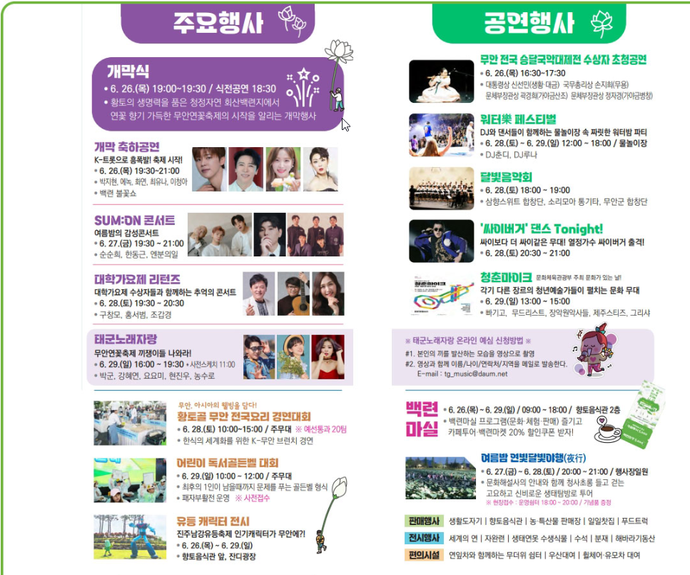 무안 연꽃축제의 하이라이트 중 하나는 화양연화 콘서트예요. 개막일인 6월 26일 박지현, 에녹의 공연을 시작으로, SUM:ON 콘서트, 대학가요제 리턴즈 등 다양한 무대가 준비돼요.