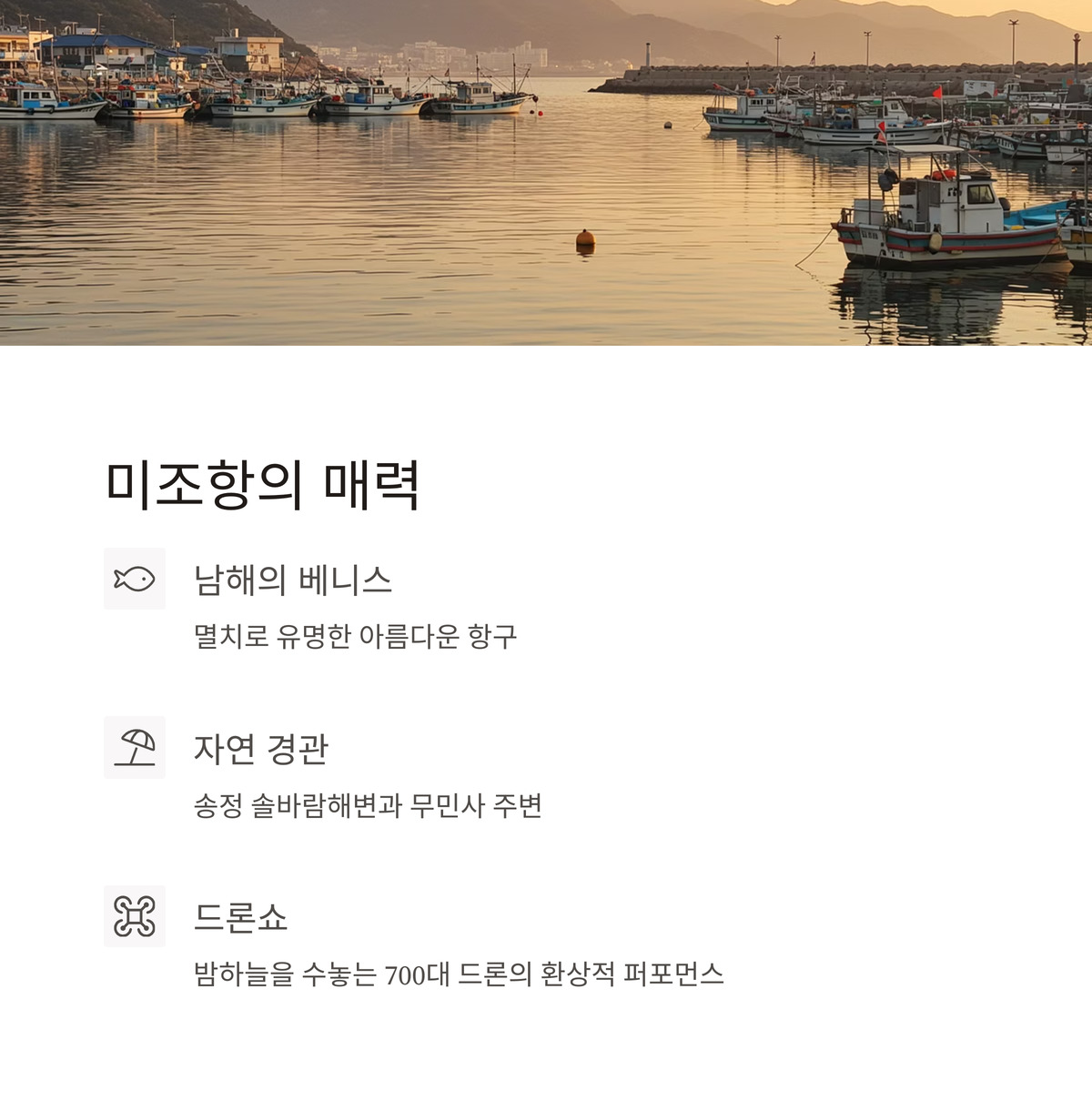 드론 라이팅 쇼, 멸치잡이 퍼포먼스, 수산물 요리 경연으로 미조항의 밤을 화려하게 즐겨보세요!