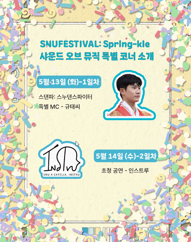 사흘간 이어지는 행사는 잔디광장과 버들골 풍산마당을 중심으로 펼쳐져요. 자세한 일정은 서울대 공식 인스타그램에서 확인하세요!