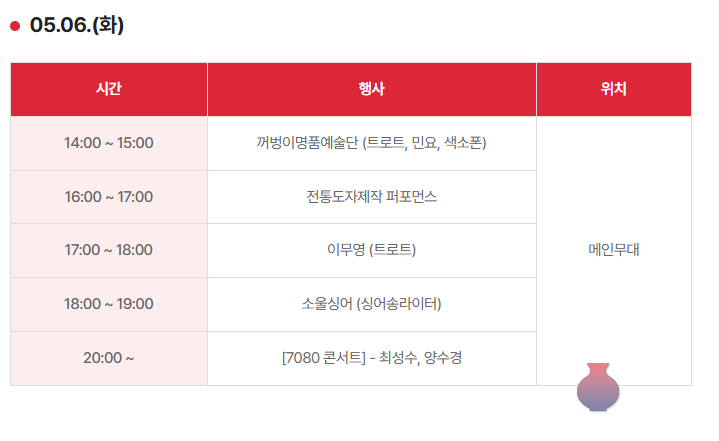 여주도자기축제의 밤은 출렁다리 콘서트로 더욱 빛나요. 신륵사 인근 여강 출렁다리 주변에서 열리는 이 공연은 퓨전 국악, 팝페라, 트로트 등 다양한 장르로 구성돼 있죠. 여강의 물결과 함께 울려 퍼지는 음악은 낭만 그 자체예요.