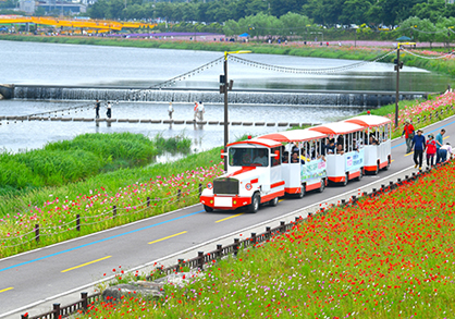 장성 황룡강 길동무 꽃길 축제의 인기 프로그램, 꽃길열차는 봄꽃정원을 감상하며 이동하는 체험이에요.