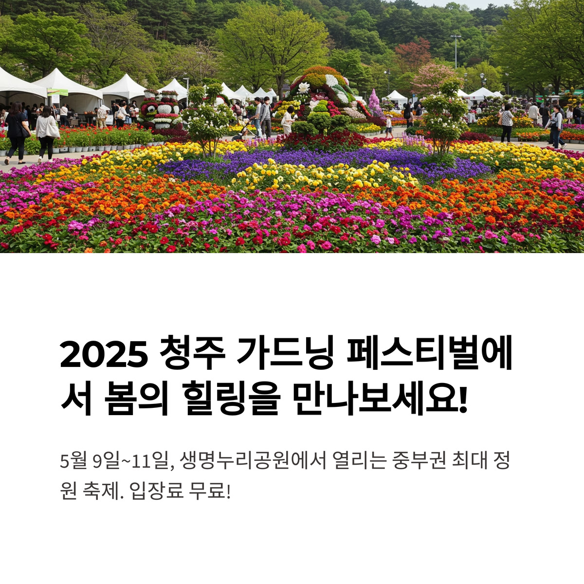 충북 청주시의 청주 가드닝 페스티벌이 2025년 5월 9일부터 11일까지 생명누리공원에서 열립니다. 정원 전시, 가드닝 클래스, 문화 공연으로 가득한 이 축제는 봄날의 힐링을 선사해요.