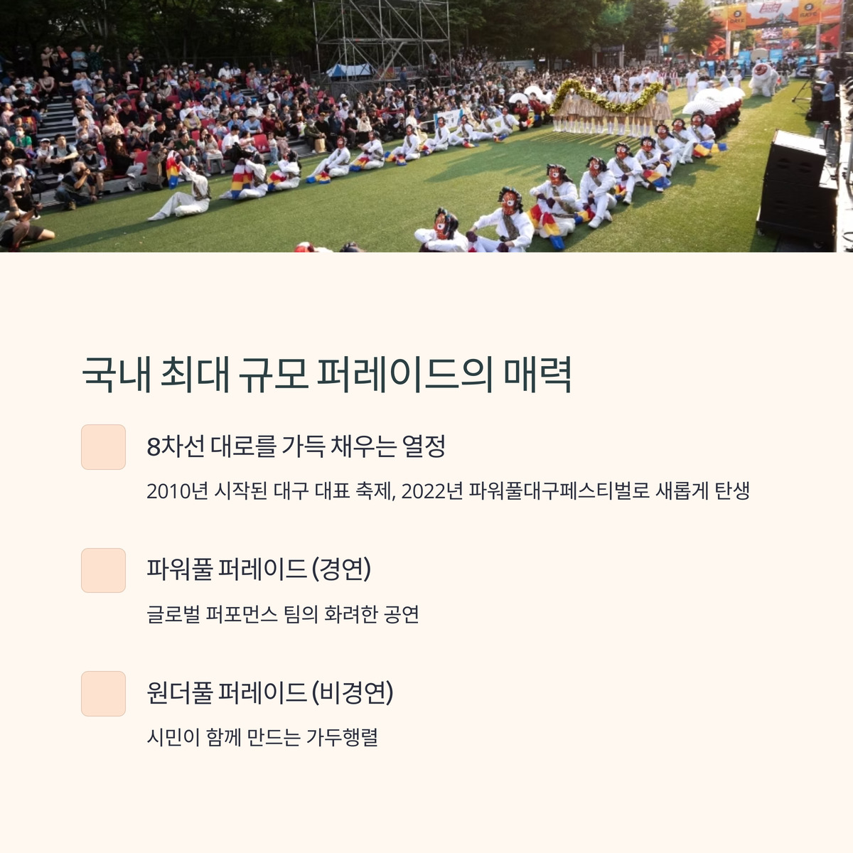 남녀노소 누구나 즐길 수 있는 이 축제에서 대구의 활력을 느껴보세요!