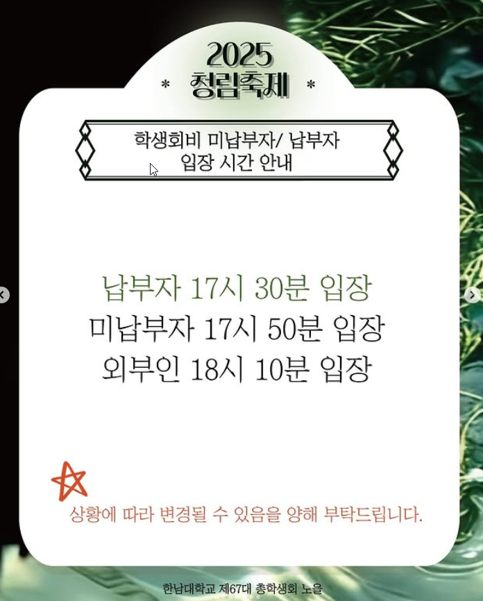 2025년 한남대 축제는 외부인 입장이 가능해요! 공연장은 선착순 입장이니 저녁 5시 전 도착을 추천해요. 최신 정보는 한남대 공식 홈페이지에서 확인하세요!