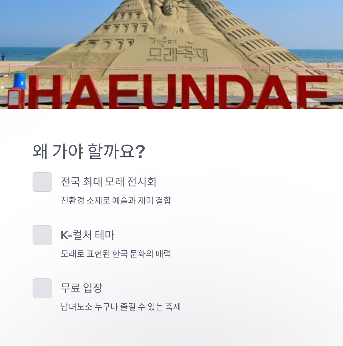 무료로 즐길 수 있는 이 축제는 가족, 연인, 친구와 함께 부산의 바다와 모래를 만끽하며 K-컬처의 매력을 느끼기에 딱이에요. 해운대 모래축제에서 특별한 추억을 쌓아보세요!