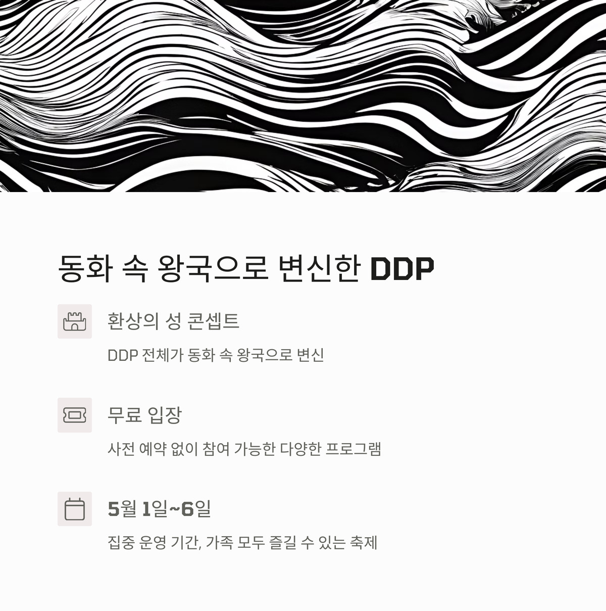 DDP 봄축제는 디자인과 예술, 놀이와 공연이 어우러진 서울의 대표 봄 행사예요. 해치 퍼레이드, 잔디언덕 콘서트, 디자인 놀이터, 협력 전시 등 무료로 즐길 수 있는 프로그램이 가득하죠. 아이들에게는 상상력을, 어른들에게는 감성을 선사하는 디자인 테마파크에서 특별한 5월을 만들어보세요.