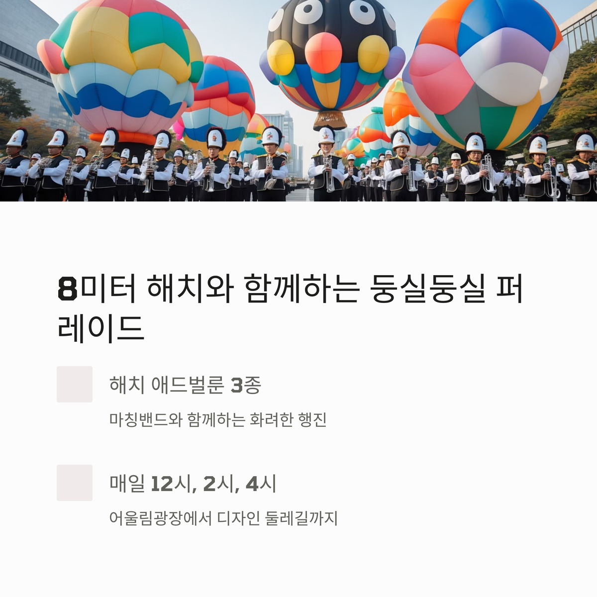 해치 벌룬과 함께 사진을 찍으며 서울의 봄을 만끽해보세요! 퍼레이드 경로는 어울림광장에서 시작해 디자인 둘레길까지 이어져요.